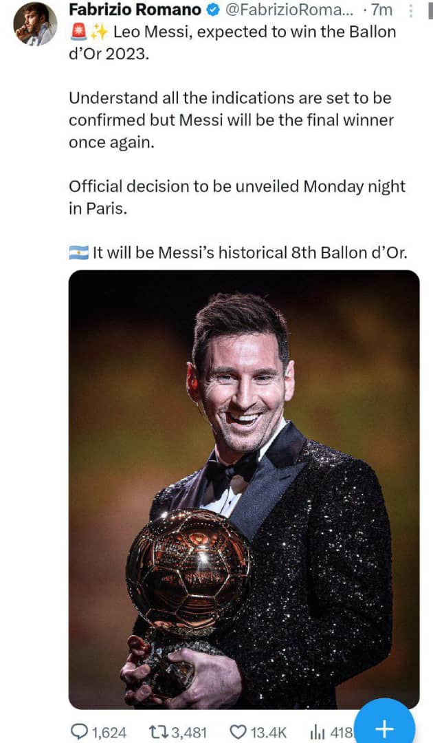 فابریزیو رومانو: توپ طلا سال ۲۰۲۳ به لیونل مسی خواهد رسید.